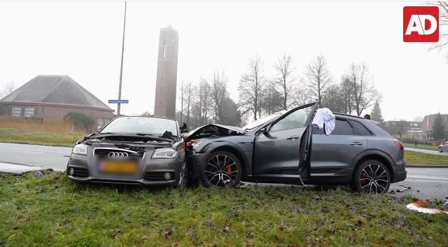 Hier zoomen we in op de vorige foto. We zien hoever de Audi e-tron SUV zich in de Audi A3 Cabriolet van Janneke Sparreboom-van der Spoel heeft geboord. Achter de wagen zien wij de blonde haren van mevrouw Janneke Sparreboom op de brandcard, eerst de zuster dan een wit iets (een plastic zak?) en dan Janneke's mooie krullen die zij zich net nog had laten föhnen door kapster Monaliza Suurbach van Monaliza Hairstudio hier vlak achter naast de Heilige Petruskerk. We zien het linker spatbord van de Cabriolet dat verfrommeld is, de deuk is de SUV niet tegen aangekomen, maar vanaf de deurstijl heeft het materiaal zich verder verwrongen, en dit is nog voordat de Brandweer er de schaar inzet, om de motorkap te verwijderen. Het is de laatste keer geweest dat Janneke in haar Audi A3 Cabriolet gereden heeft. Maar gelukkig zijn er in de Hemel heel veel nieuwe Audi's, hairstudio's, recitals, hockeyvelden, en wat nog niet meer. Eerst wel even doorheen het Purgatorium. De mannen van de Brandweer helpen nu nog even de bestuurder uit zijn of haar of anders Audi e-tron SUV. Dit is geen al te beste reclame voor Audi, twee Audi's op elkaar, met de ringen zo prominent in beeld. (Janneke Sparreboom-van der Spoel Spatbord, blonde haren Sa20260415 Omr. Flevol. vs02.jpg)(544 x 343 42.084 > width"794" x height"502")