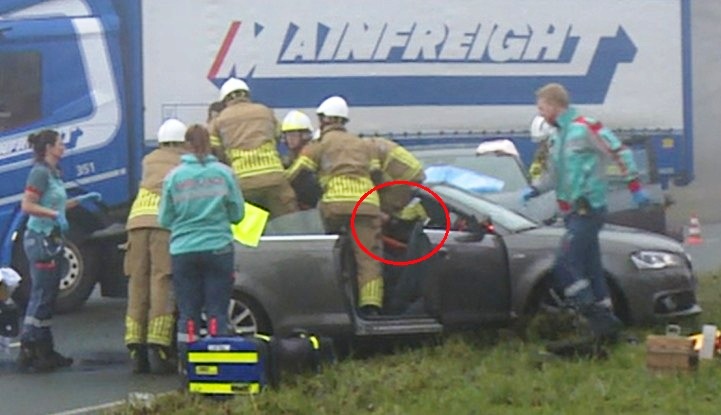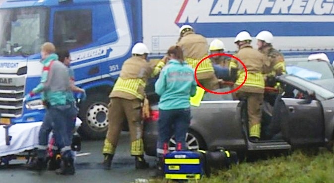 Op deze video zien we hoe de spinal board onder mevrouw Janneke Sparreboom-van der Spoel wordt geschoven. Op 1:07/2:47 [min/sec] zien we het hoofd van Janneke op de oranje wervelplank, we zien haar blonde haren en we zien duidelijk haar neus. Vervolgens gaat zij op de brancard de ambulance in. We zien ook nog twee lol met elkaar makende 'fotografen' waar de mannen van de Brandweer handelingen uitvoeren in het motorcompartiment van de Audi van mevrouw Sparreboom. v 112Today https://www.youtube.com/watch?v=0YhZzlcbVEs